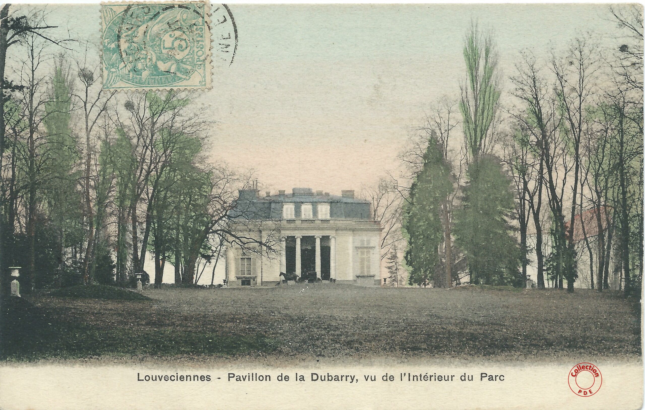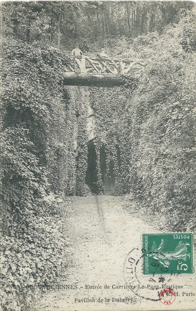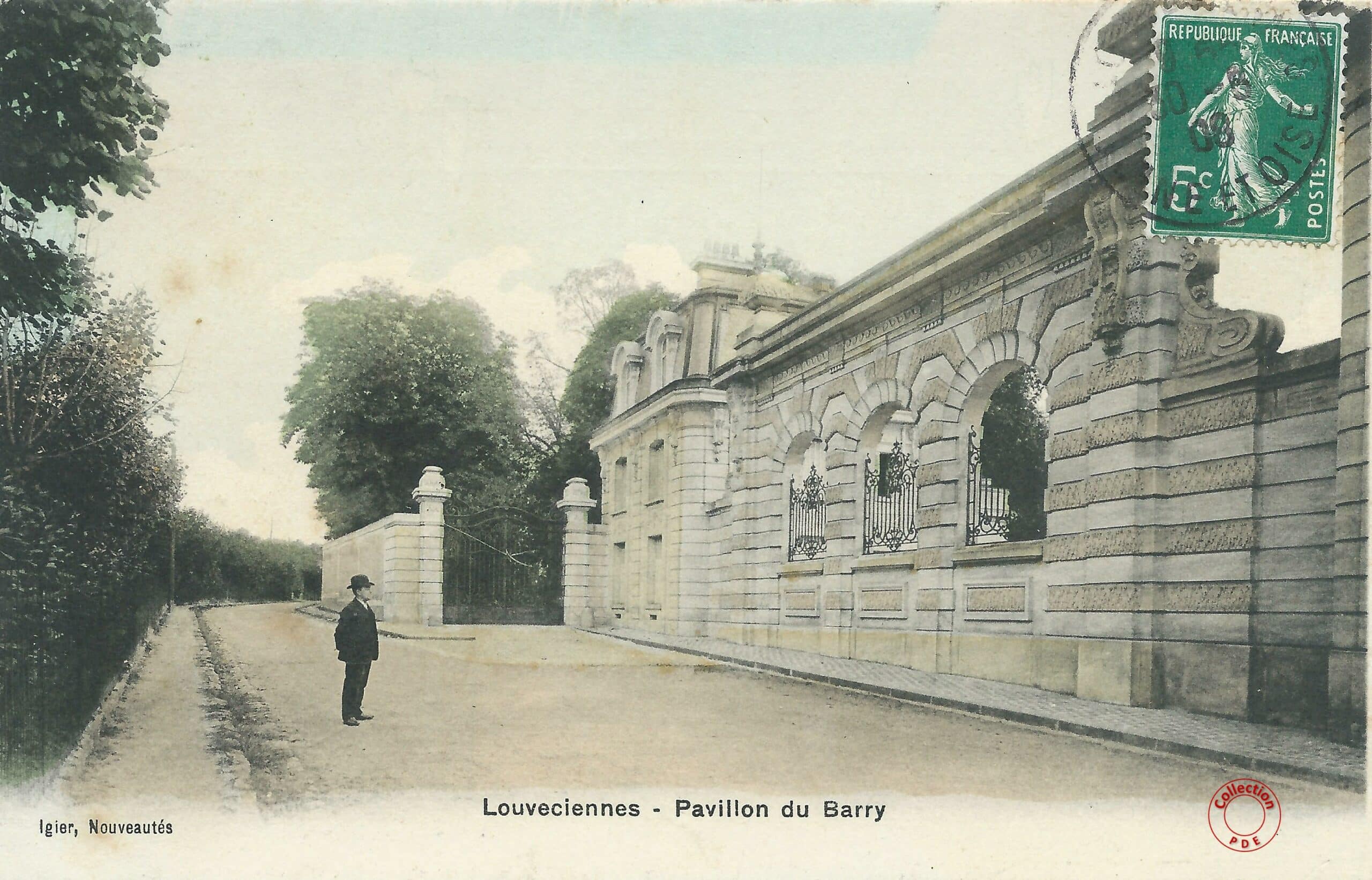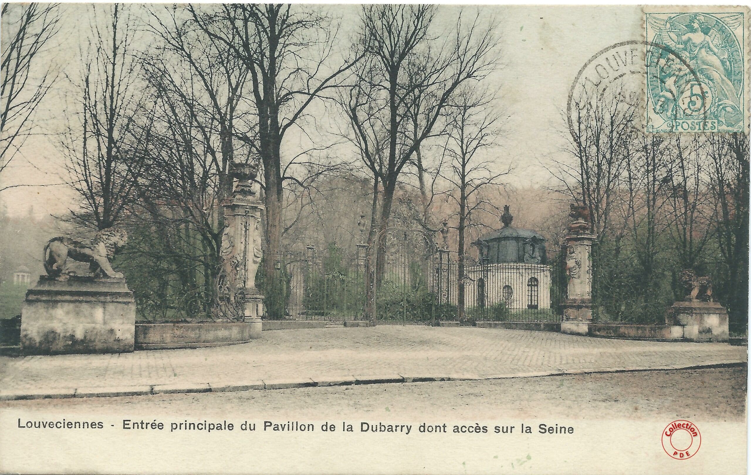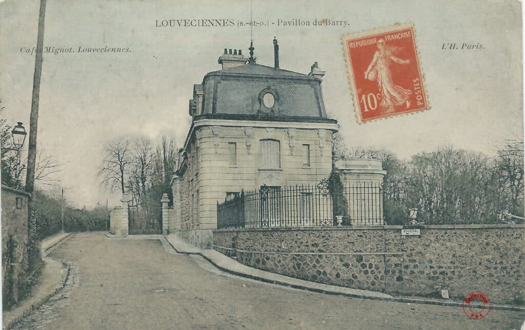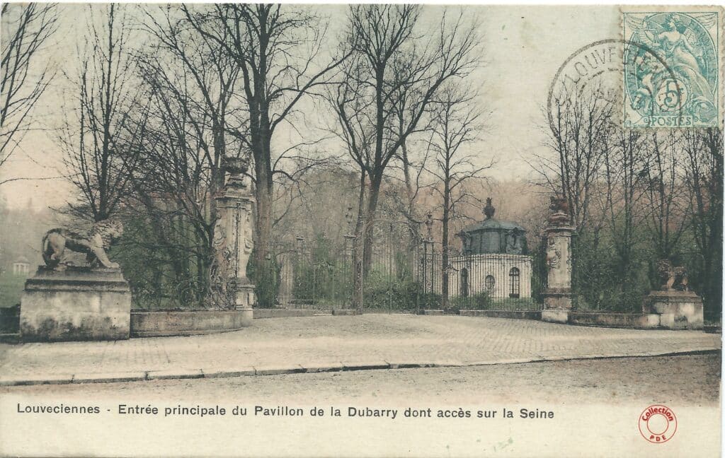 Nous arrivons par l’entrée principale du Pavillon du Barry sur les quais de Seine à Bougival. Le pavillon à droite de la grille est identique à celui que l’on retrouve aujourd’hui au 29 rue de la Princesse à Louveciennes. On distingue aussi sur la gauche du lion, le Temple de l’Amour.